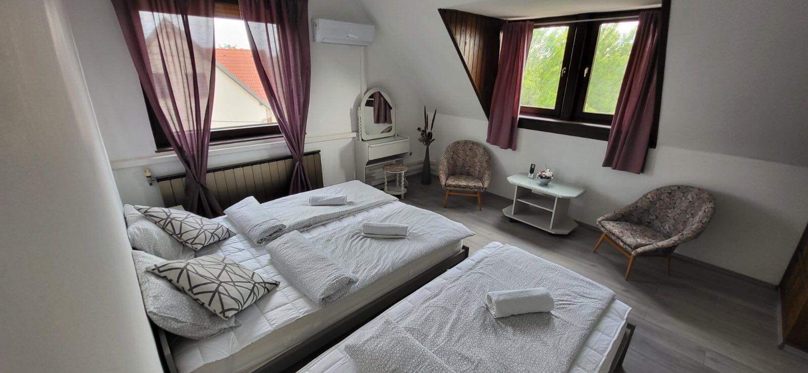 25 m2 | Legfeljebb 4 fő elszállásolására alkalmas | 1 kétszemélyes franciaágy | 1 egy személyes ágy + pótágy | 1 saját fürdőszoba + WC | Utcai panoráma egyik oldalról és távolba a Balaton | Hűtő-fűtő klíma (ingyenes) | Közösségi térben teakonyha használata, valamint a fsz-en gépesített | Konyha, mosókonyha használata
